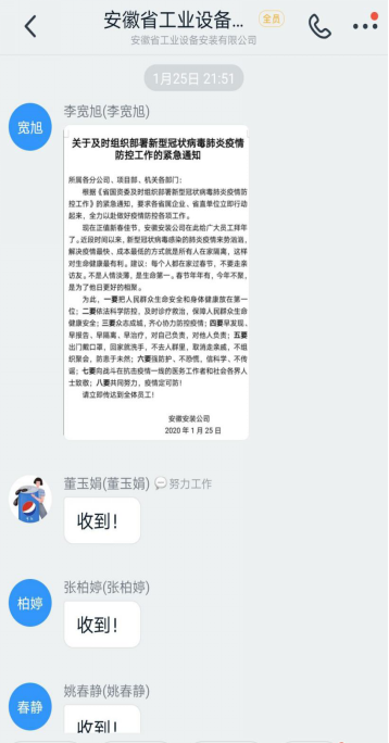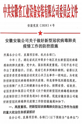二是部署到位。疫情防控工作開展后,1月25日(大年初一)安徽安裝公司發(fā)出防控疫情工作的緊急通知,1月27日制定肺炎疫情防控措施,對疫情防控工作進(jìn)行細(xì)化安排,周密部署。要求各分公司、直屬項(xiàng)目部、各部門要以對職工群眾生命安全高度負(fù)責(zé)的態(tài)度,精準(zhǔn)施策,堅(jiān)決遏制疫情在安徽安裝公司輸入、蔓延,鼓勵(lì)職工戴口罩、勤洗手、多通風(fēng)、少走動(dòng)、常消毒。