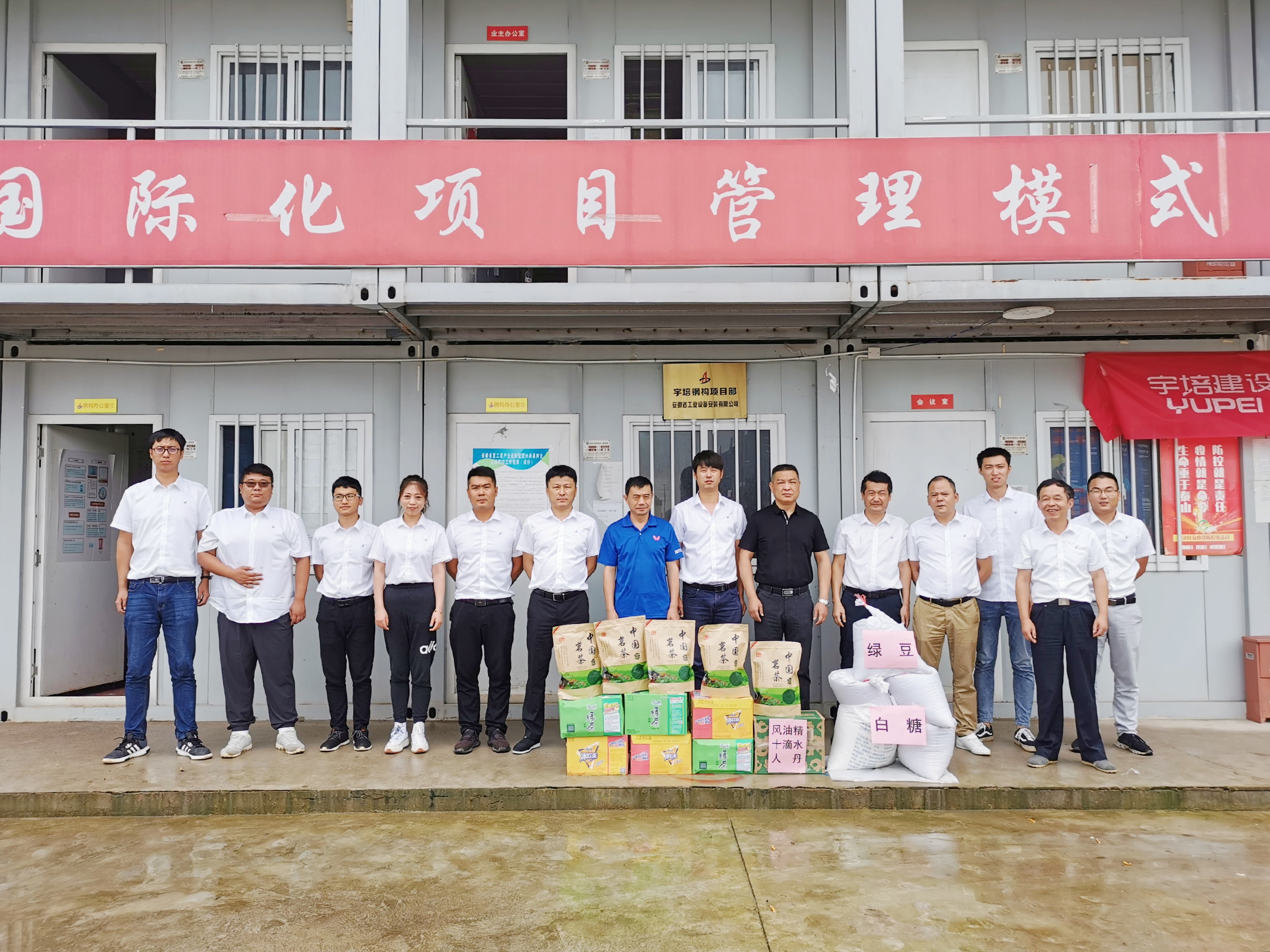 7月17日上午,公司領(lǐng)導(dǎo)走訪慰問了合肥分公司蕪湖宇培鋼結(jié)構(gòu)項目部,為高溫天氣堅守在工作一線的項目部員工帶來了夏日防暑的常用藥品及飲料、綠豆、白糖、茶葉等。要求項目部堅持以人為本,一定要做好常態(tài)化疫情防控、防暑降溫、雨期安全工作,尤其是高溫、大風(fēng)等極端天氣更要精心部署,合理安排作業(yè)內(nèi)容,避開高溫時段施工,每日班前做好員工精神狀態(tài)確認,安全提醒到位,確保高溫季節(jié)一線職工安全度暑。