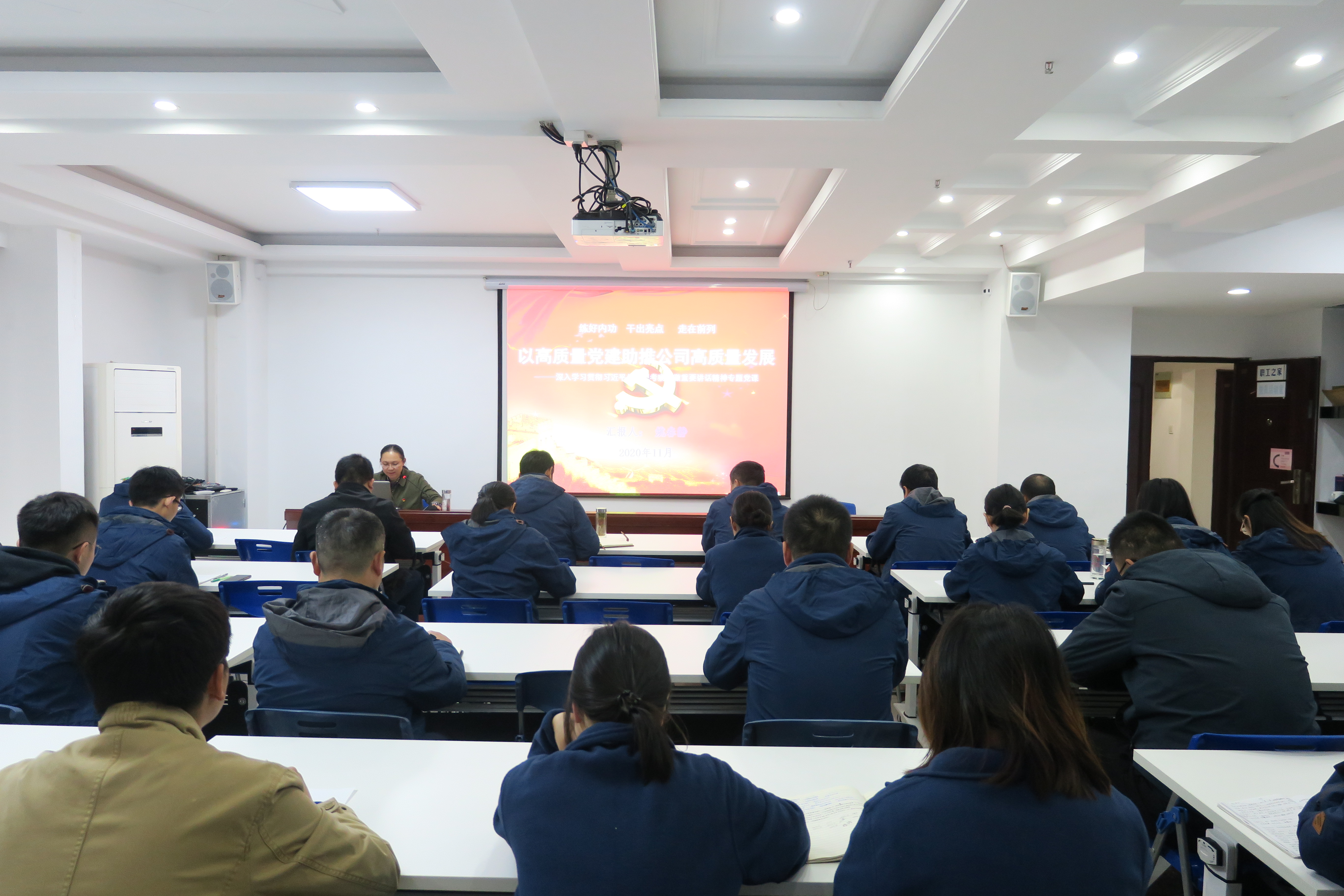 11月19日下午,公司機關第二黨支部書記姚春靜赴合肥分公司作題為《練好內功·干出亮點·走在前列 以高質量黨建助推公司高質量發(fā)展——深入學習貫徹習近平總書記考察安徽重要講話精神》專題黨課,分公司領導班子成員、支部黨員、入黨積極分子、青年團員、機關及在肥人員共40余人參加了會議。會議以視頻的方式進行,主會場設在公司職工之家,靈璧項目部、潛山項目部設立了分會場。