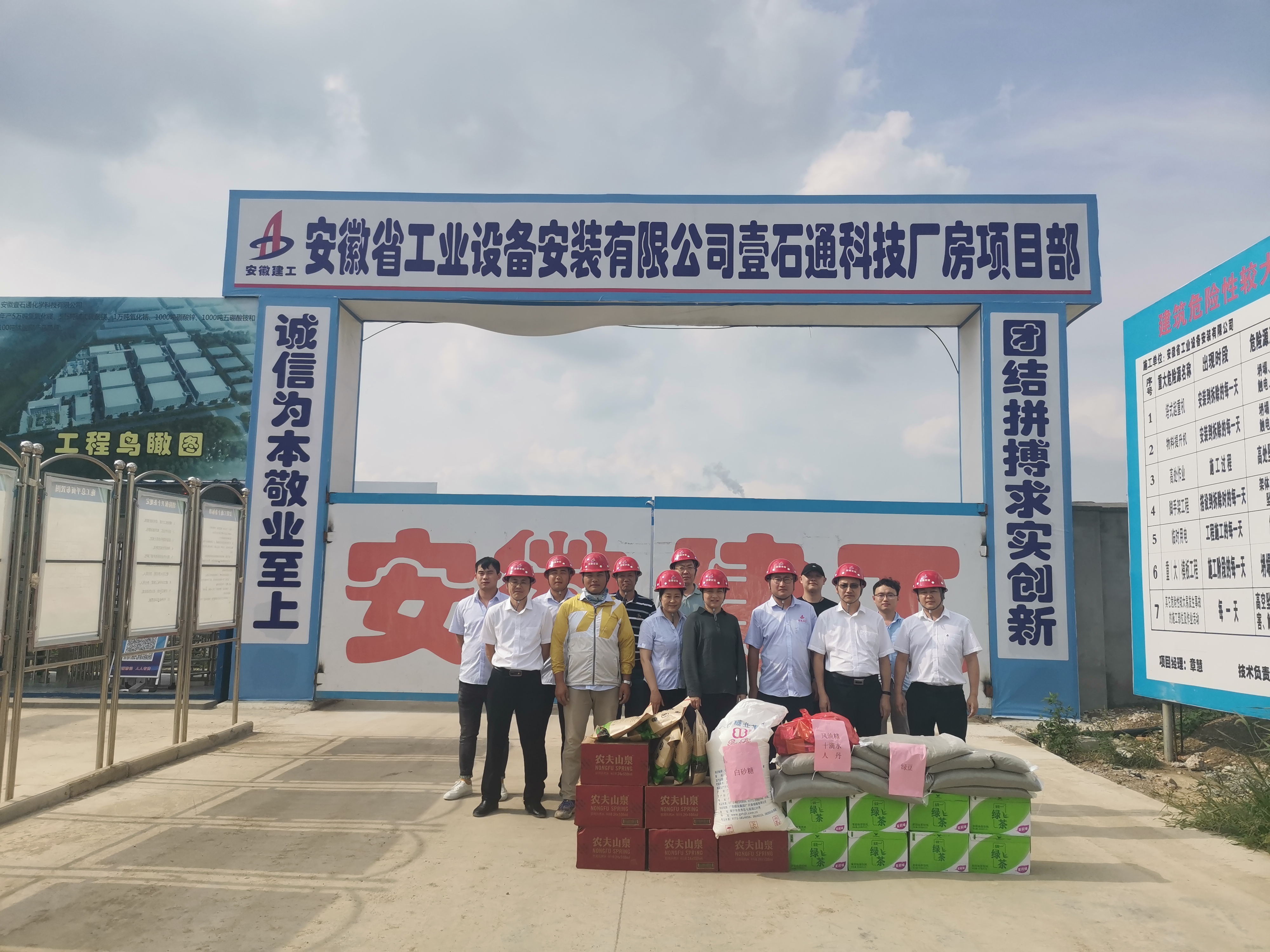 公司工會帶著白糖、綠豆、茶葉、飲料、藥品等防暑降溫物品,先后來到安慶石化熱電部廠際邊界降噪治理完善項目、安慶石化Ⅰ循噪音治理項目、宿州新宇藥業微生物藥物生產建設項目一期工程項目、靈璧縣迎賓大道改造工程專業承包(EPC)項目、蚌埠臨港智能制造產業園項目及定遠壹石通化學科技廠房項目,給廣大一線職工送去工會組織的關愛。