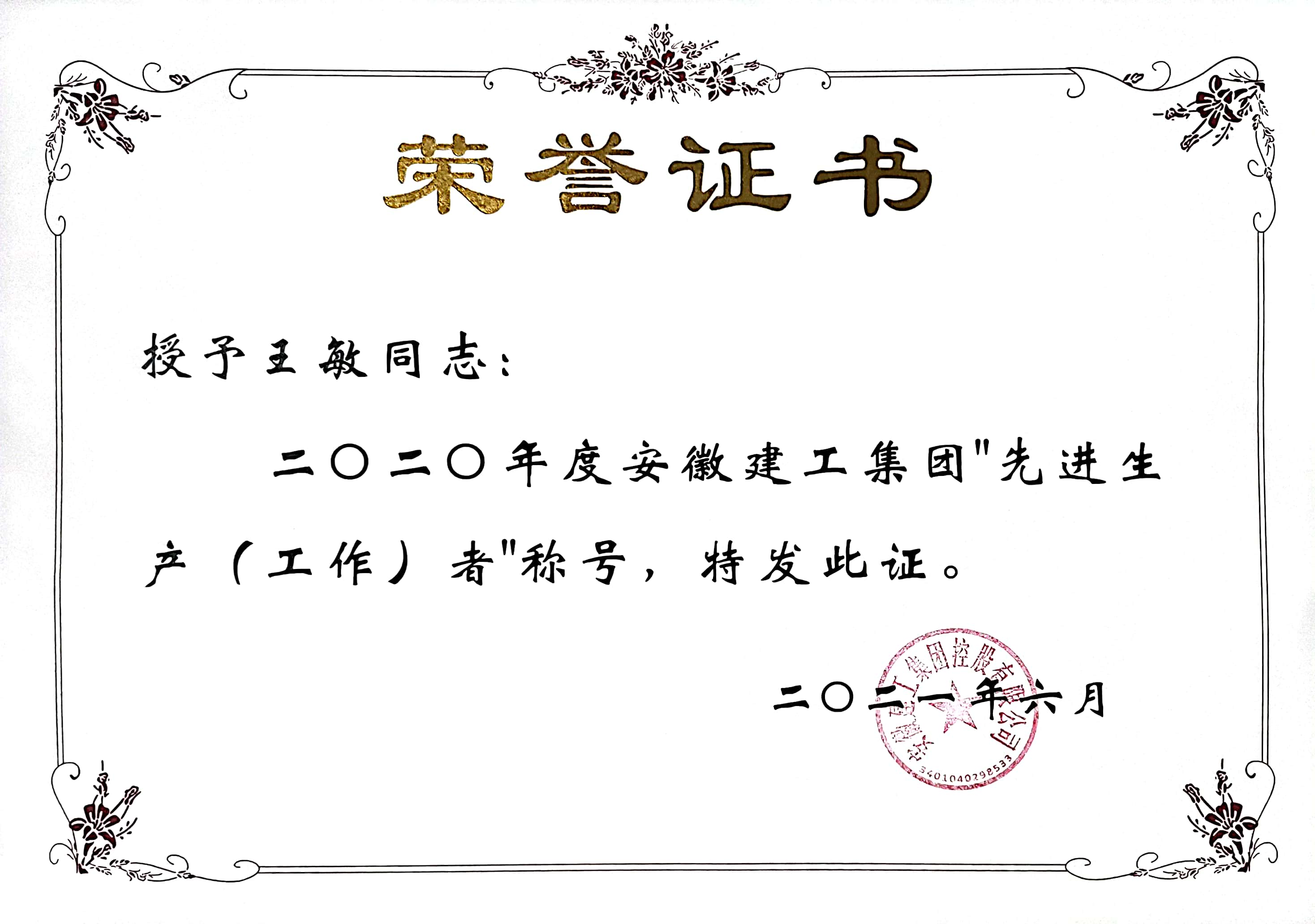 在工作作風(fēng)上,王敏一貫堅持對自己高標(biāo)準(zhǔn)嚴(yán)要求,腳踏實地,勤奮敬業(yè),認(rèn)真細(xì)致,勤于思考,盡心盡責(zé),主動、積極地做好每一項工作,認(rèn)真履行崗位職責(zé)。她時常告誡自己要以德服人,以身作則,并在實際工作中努力實踐著這一思想 ,注重自己的一言一行,公正、客觀,一切從大局出發(fā),不謀私利,不圖己便,廉潔自律,做到自重、自省、自警和自勵。2021年,王敏由于出色的工作成績,被評為“安徽建工集團2020年度先進生產(chǎn)(工作)者”,她說,這是集團對她過去工作的肯定,也是對她未來工作的要求。