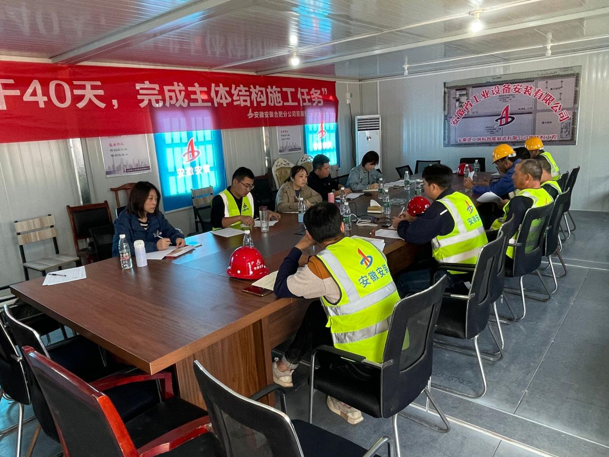 10月29日,安徽安裝合肥分公司建工智能鋼構項目在項目部會議室開展“大干40天,完成主次構施工任務”勞動競賽大討論。公司紀委副書記、工會副主席王敏,合肥分公司副經理夏國祥、工會副主席杜瓊、項目管理人員等參加會議。