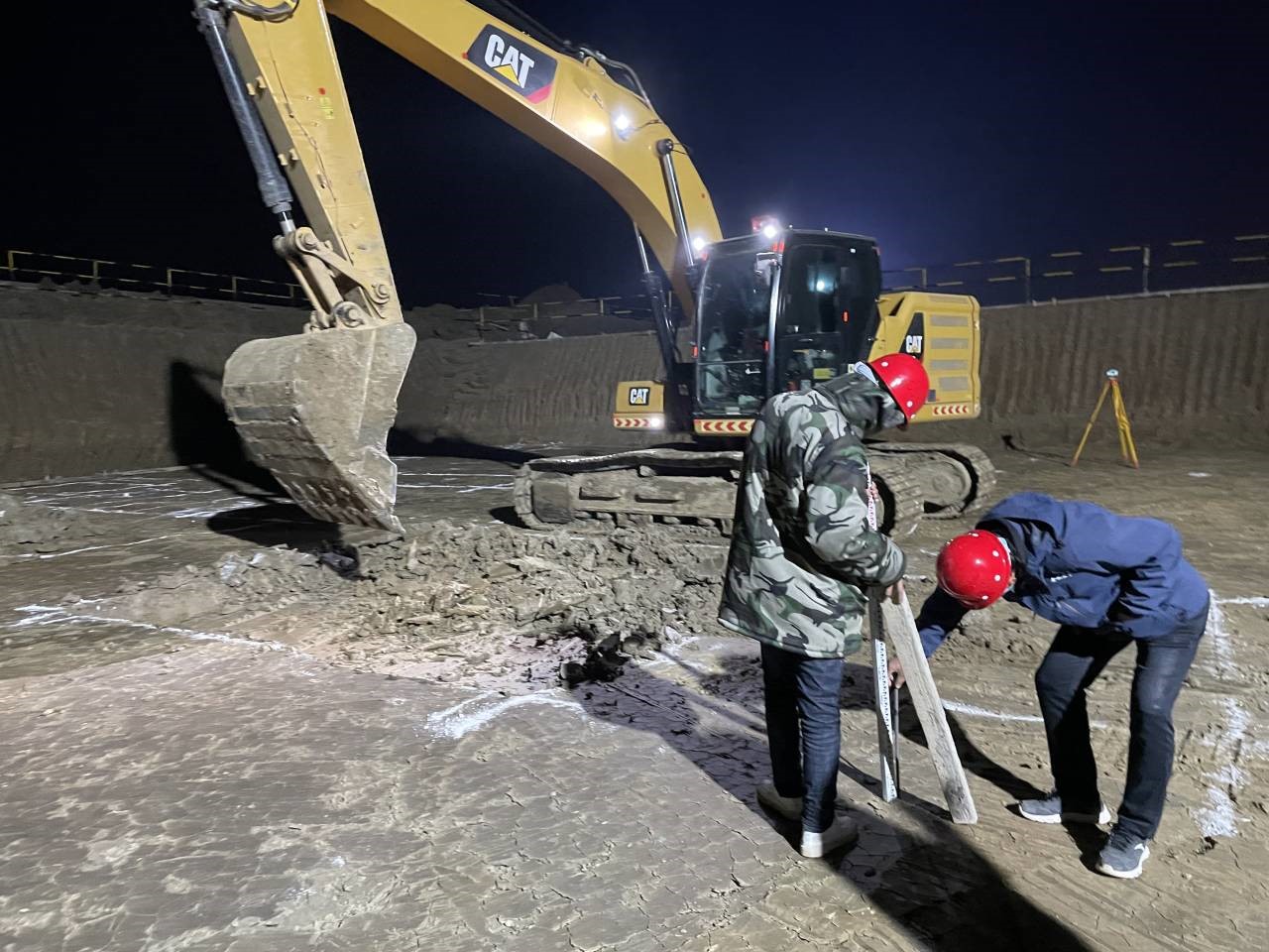 為滿足西動力中心承臺澆筑要求,施工現場燈火通明,項目經理徐明東帶領施工員正在認真進行西動力中心承臺基礎測量復核工作。