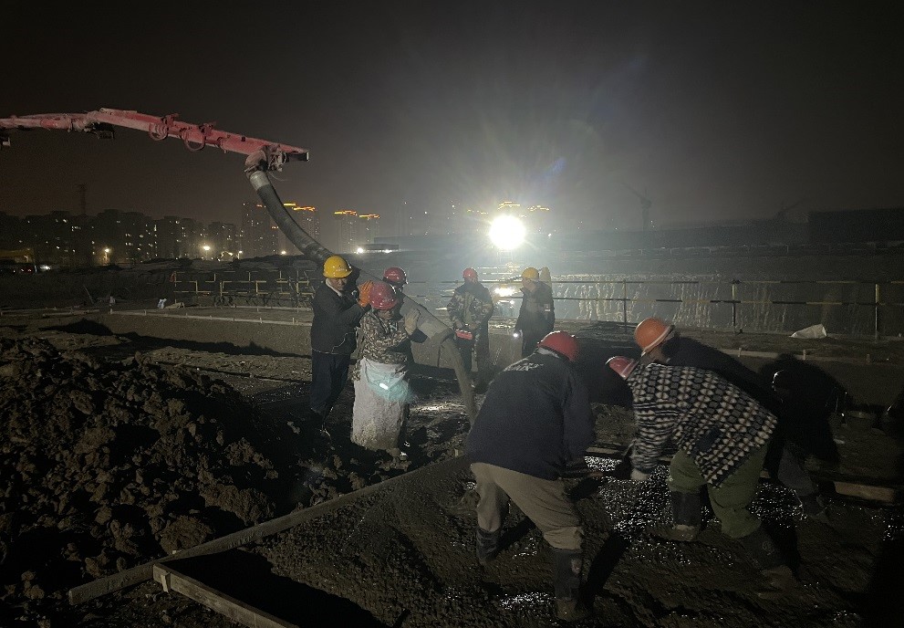 工人師傅們晚上加班加點進行西動力中心基礎墊層澆筑
