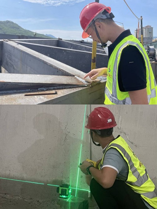 圖為岳西恒太城項(xiàng)目穹頂鋼結(jié)構(gòu)檢查及影廳看臺(tái)放線場(chǎng)景