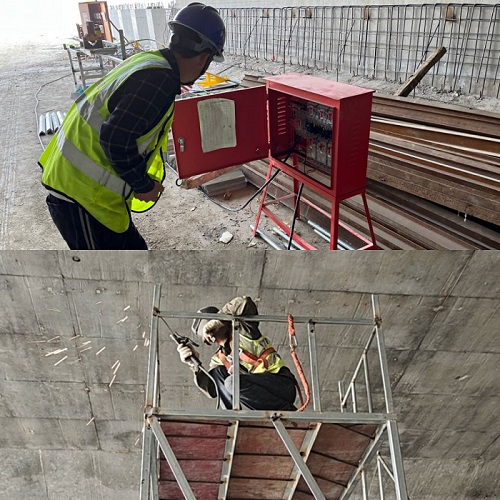 圖為花園大道道路工程項(xiàng)目現(xiàn)場(chǎng)臨時(shí)用電檢查及登高架焊接場(chǎng)景