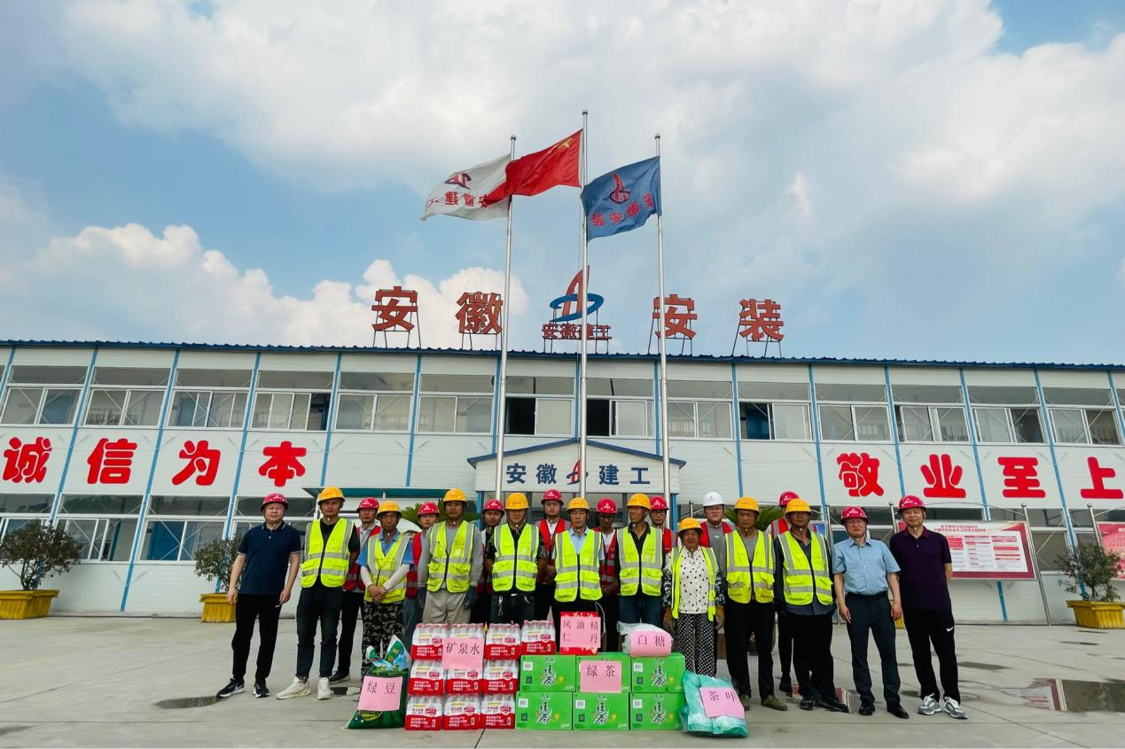 近日高溫來襲,為做好夏季高溫作業勞動保護工作,6月13日下午,蚌埠分公司經理、黨支部副書記趙銘亮,黨支部書記、副經理王偉,副經理趙榮珣前往輝隆項目部開展送清涼慰問活動,為項目部管理人員和工人們免費發放防暑降溫清涼物資。