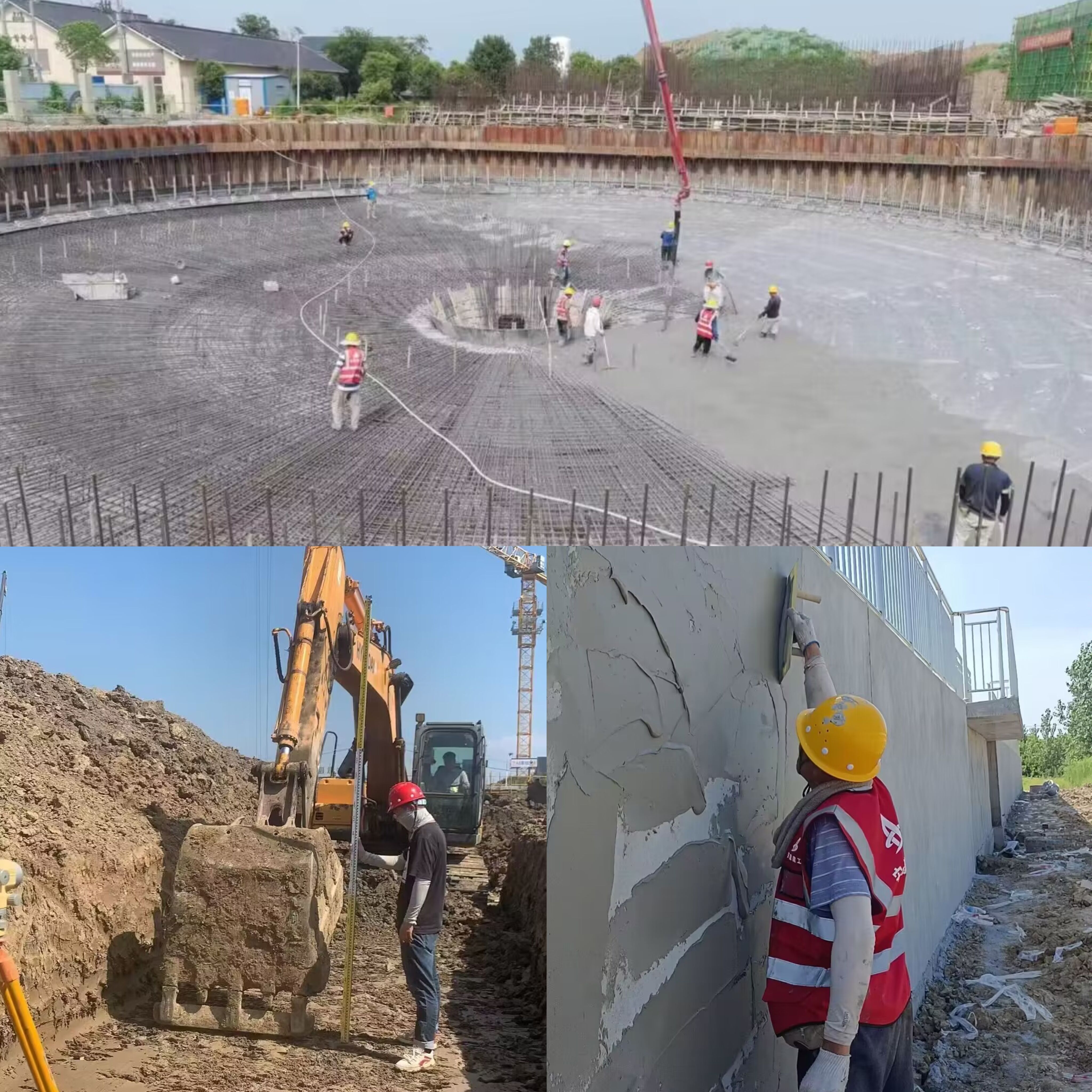 圖為:阜南城南污水處理廠改擴(kuò)建及配套管網(wǎng)工程二沉池筏板混凝土澆筑、配電房基礎(chǔ)開挖及均質(zhì)池外墻粉刷施工