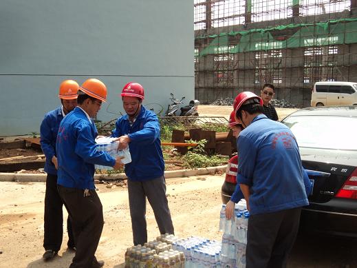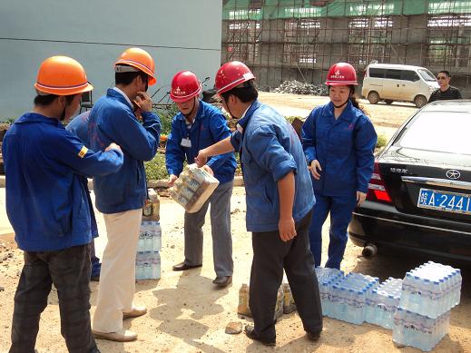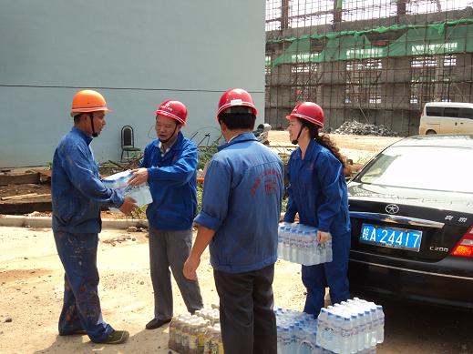 7月28日,氣溫高達36度,酷暑難耐,分公司書記、經(jīng)理李貴林,副經(jīng)理史崇松、方斌、劉紅艷一行深入一線工地,慰問戰(zhàn)斗在一線的生產(chǎn)、管理人員。每到一處,李貴林同志都會關(guān)切的詢問防暑和安全情況,并將一箱箱礦泉水送到一線人員的手中,使他們在夏日里感受到了一縷清爽的涼風。