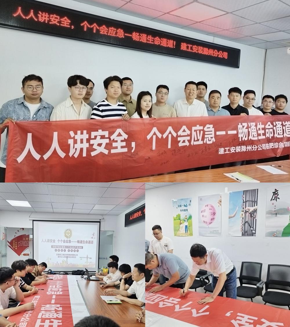 2024年6月是全國第23個安全生產月。5月31日上午,建工安裝滁州分公司、新能源分公司圍繞“安全生產月”主題“人人講安全、個個會應急——暢通生命通道”聯合舉行了2024年“安全生產月”活動啟動儀式。滁州分公司、新能源分公司領導班子及分公司全體成員參加了啟動儀式,儀式由滁州分公司副經理張漢軍主持。