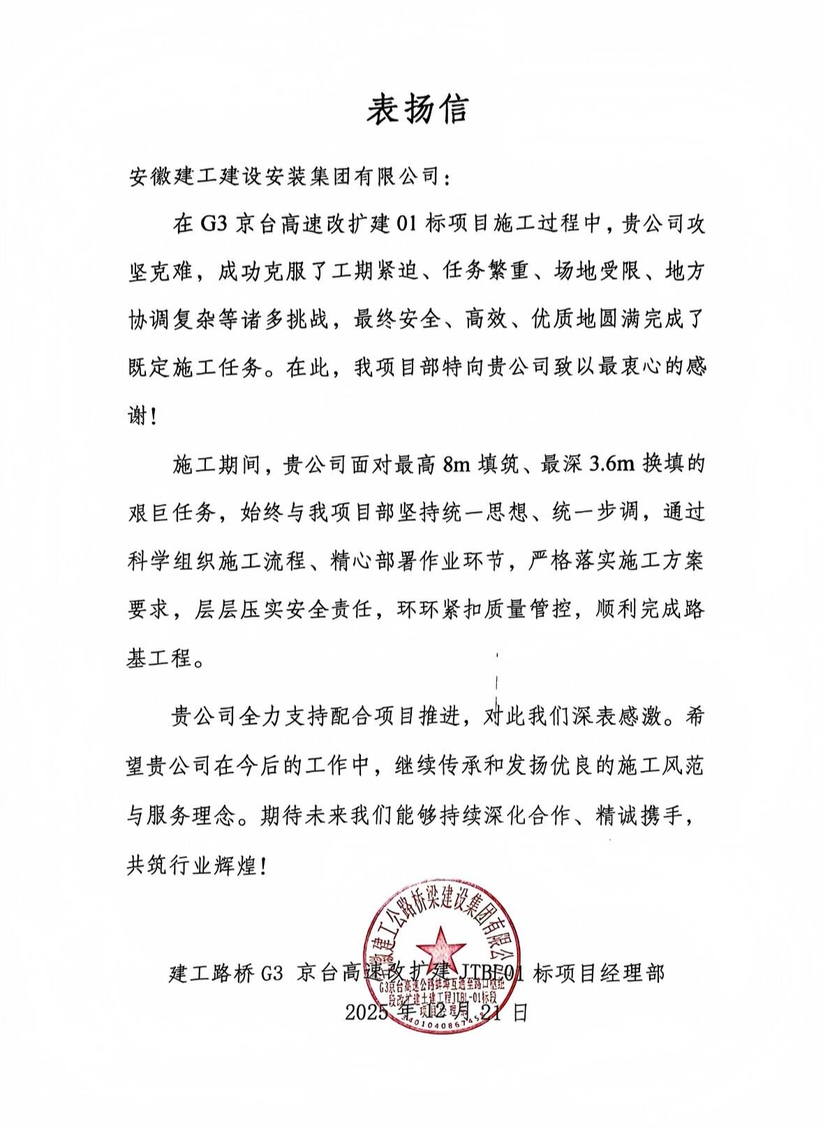 近日,建工安裝機電公司G3京臺高速改擴建項目01標土方二工區項目收到總包單位建工路橋表揚信,項目建設成果獲高度肯定。