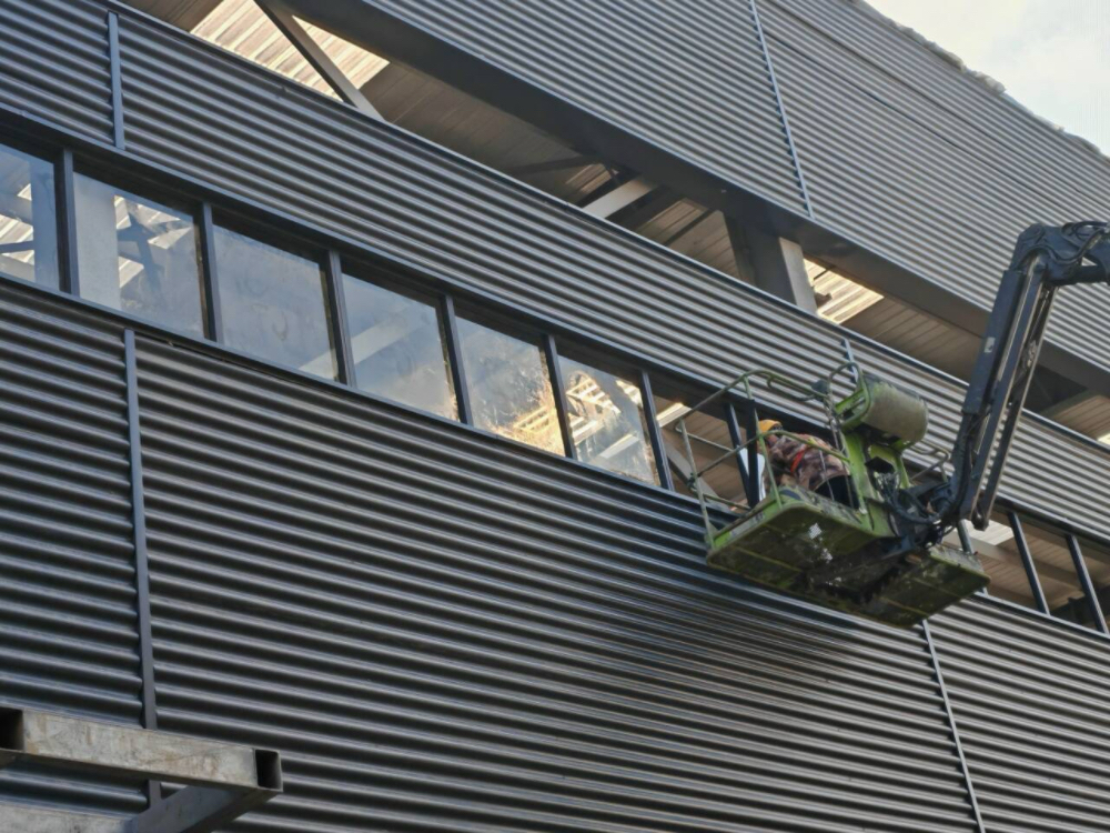 明光科順防水項(xiàng)目工人正在進(jìn)行車間外墻收口施工