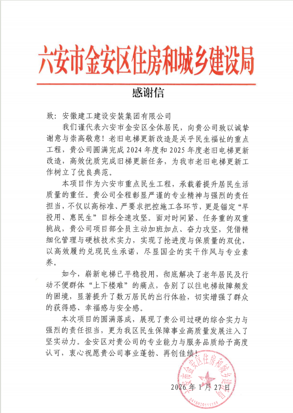 歲末年初,建工安裝接連收到來自六安市金安區住房和城鄉建設局、蚌埠市蚌山區住房城鄉建設交通局、蚌埠市城市投資控股集團有限公司的感謝信與表揚函。各方紛紛對公司2025年以來在省內多地老舊電梯更新改造項目中展現的卓越履約能力、強烈責任擔當和過硬專業素養水平給予高度評價,字里行間滿含贊譽肯定與誠摯謝意。