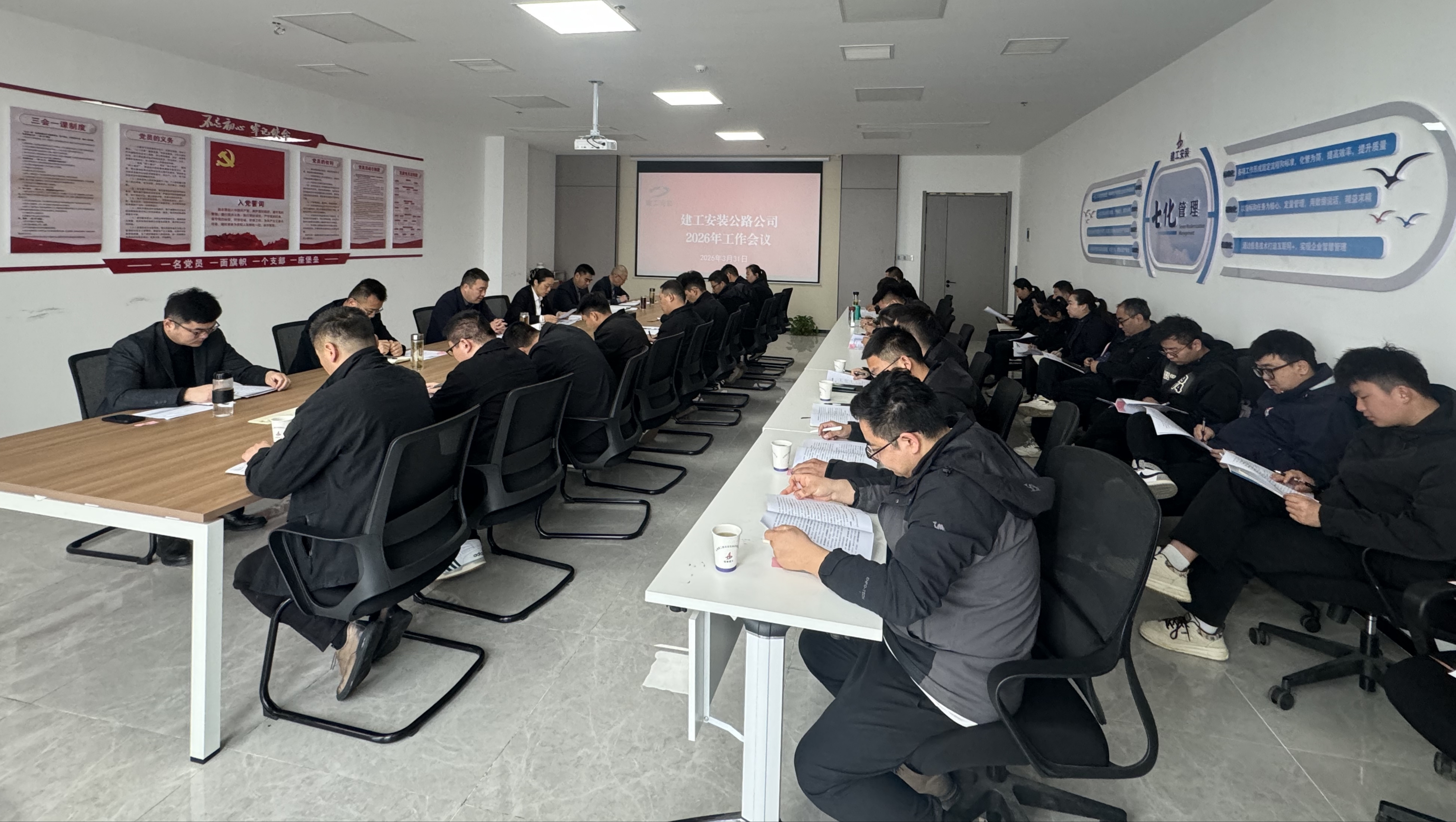 3月31日上午,建工安裝公路公司召開2026年工作會議暨4月份生產經營會,公司機關全體人員、各項目經理、全體黨員及在滁部分項目代表30余人參加會議,會議由黨支部副書記、副經理程茂麗主持。